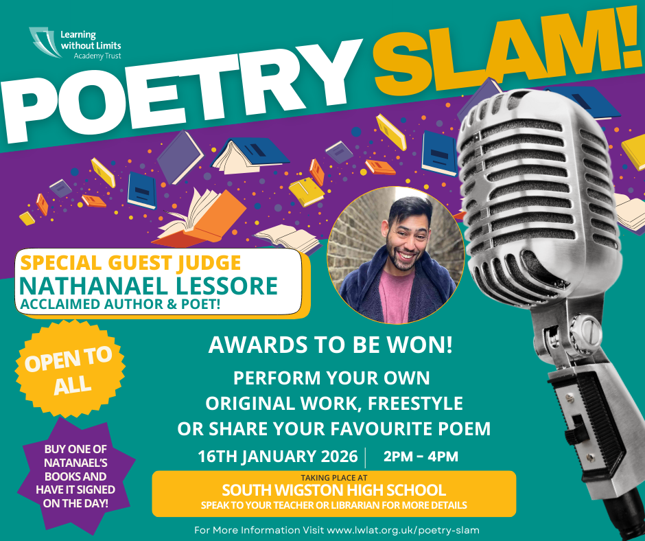 We are busing planning our 3rd Annual Poetry Slam for Friday 16th January 2026 taking place at South Wigston High School from 2:00 -4:00pm.