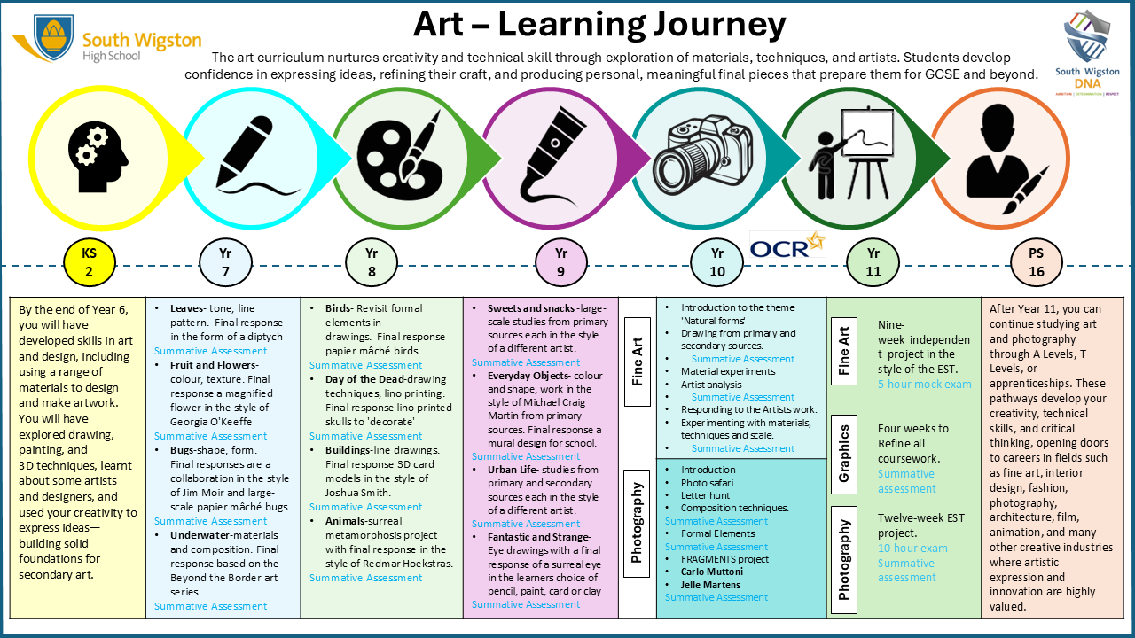 At South Wigston High School, our inclusive Art and Design curriculum inspires creativity, imagination, and a lifelong appreciation for the visual arts. We align with the National Curriculum for Art & Design at KS3, ensuring that all learners develop the knowledge, skills, and confidence to express themselves visually, think critically, and understand art’s place in history and culture.
