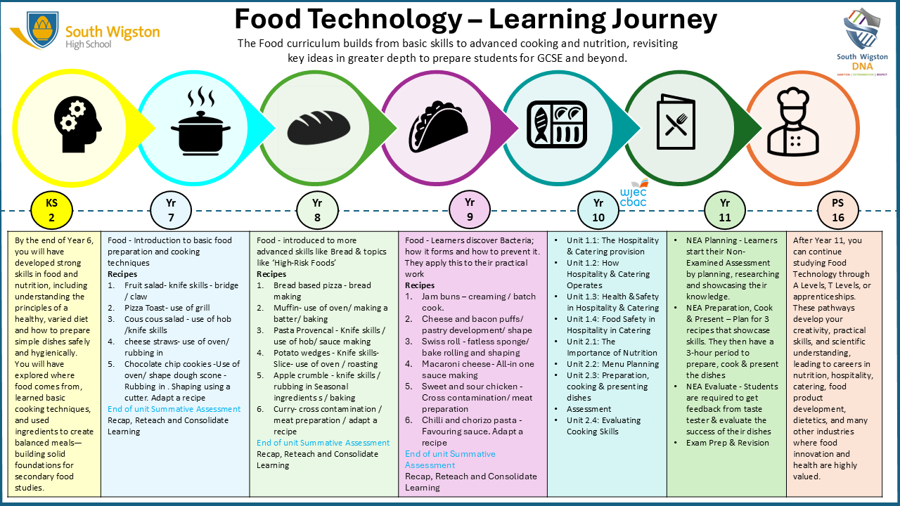 The curriculum is designed to build the foundational knowledge and skills required for success in AQA GCSE Design and Technology and Eduqas Hospitality and Catering, with clear progression from KS3 to KS4. It is designed around the requirements of the National Curriculum and the Design and Technology and Hospitality and Catering specifications. It ensures that all learners, regardless of background or ability, can access and succeed.