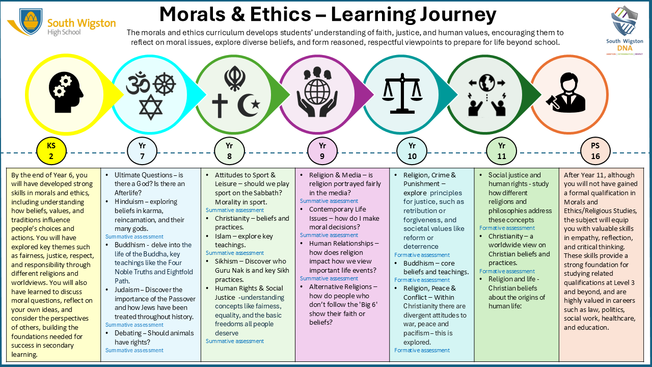 At South Wigston High School, our Morals and Ethics curriculum is designed to nurture learners into thoughtful, principled, and respectful individuals. Rooted in our school values of Ambition, Determination, and Respect, the curriculum aims to connect their real-world experience with the big questions of today. As they move through the curriculum they will learn about religious and worldviews and approaches that are different to their own. This is powerful knowledge as it helps them to formulate their own views and to understand why some people do what they do because of their beliefs, whether religious or not.
