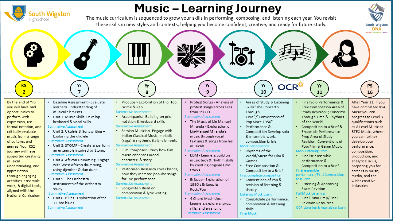 Ambition: Learners are encouraged to explore challenging musical concepts and develop technical proficiency across a range of styles and genres.