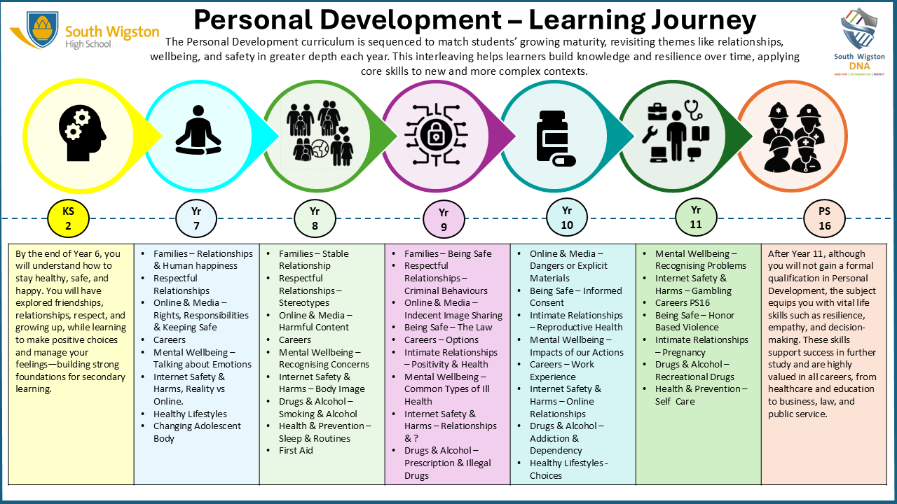 The Personal Development curriculum at South Wigston High School empowers learners to lead safe, healthy, and responsible lives—now and in the future. Rooted in our school values of Ambition, Determination, and Respect, our curriculum aims to: