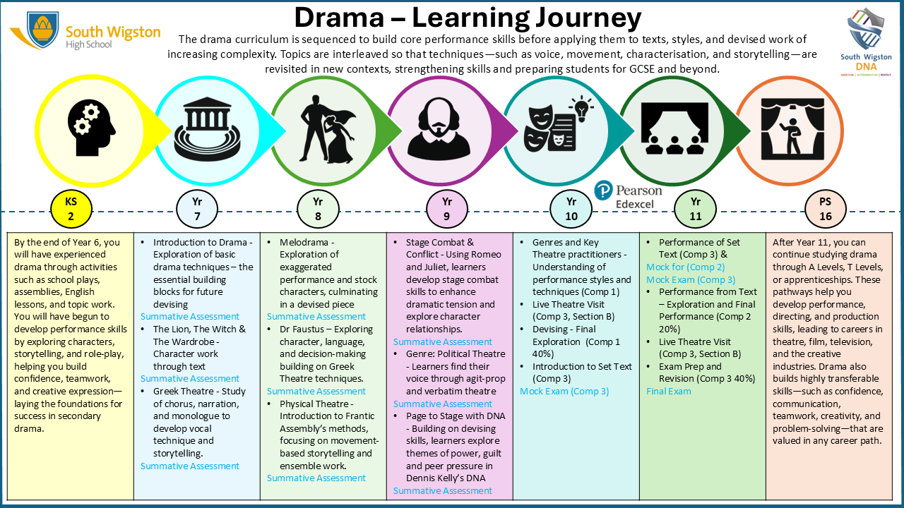 The curriculum is carefully designed to build the foundational knowledge and skills required for success in Edexcel GCSE Drama, with clear progression from KS3 to KS4. It ensures that all learners, regardless of background or ability, can access and succeed in drama.