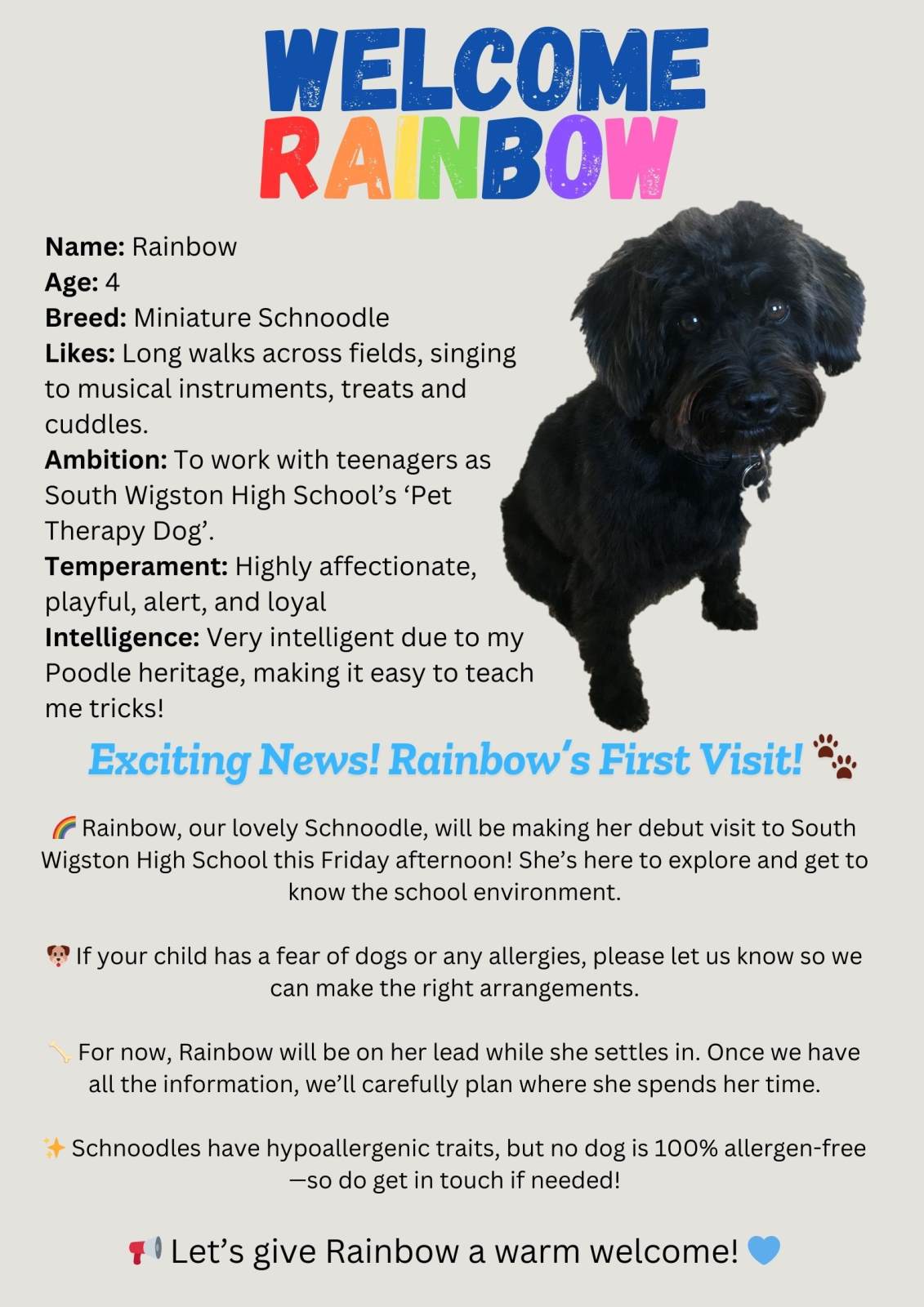 We are excited to welcome 'Rainbow' our new pet therapy dog.